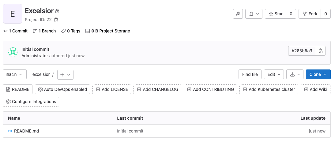 GitLab creates the excelsior project for you, and redirects you to its homepage.