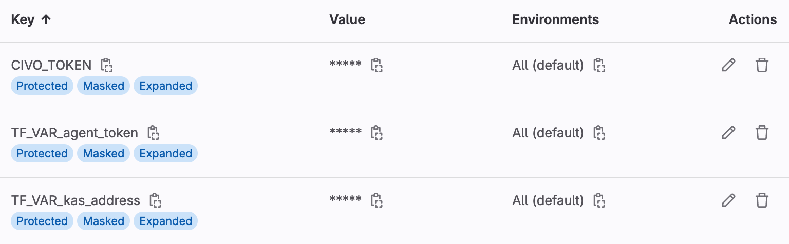 • TF_VAR_cluster_description: Set a description for the cluster. To create a reference to your GitLab project on your Civo cluster detail page, set this value to $CI_PROJECT_URL. This value helps you determine which project was responsible for provisioning the cluster you see on the Civo dashboard.